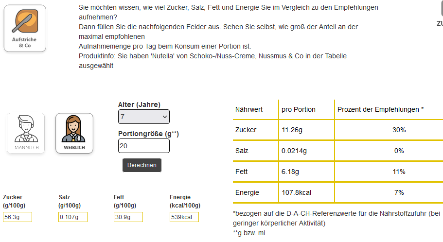 Klick auf "Berechnen" und Dir wird angezeigt, wie viel Zucker, Salz, Fett und Energie Du bei
